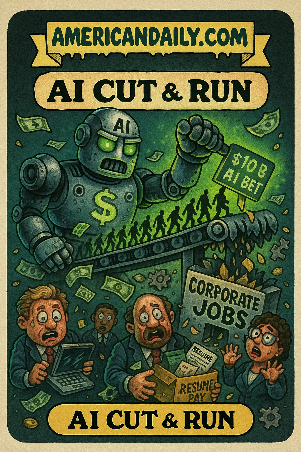 A satirical take on Amazon's announcement that it will cut thousands of corporate roles while ramping up its investment in artificial intelligence-illustrating the human cost of the tech pivot in exaggerated parody.