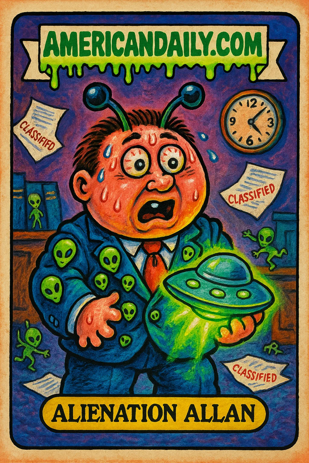 In a bizarre revelation, a U.S. congressman asserts that aliens are real and their secrets unsettling. The image draws humor from this hyperbolic disclosure.