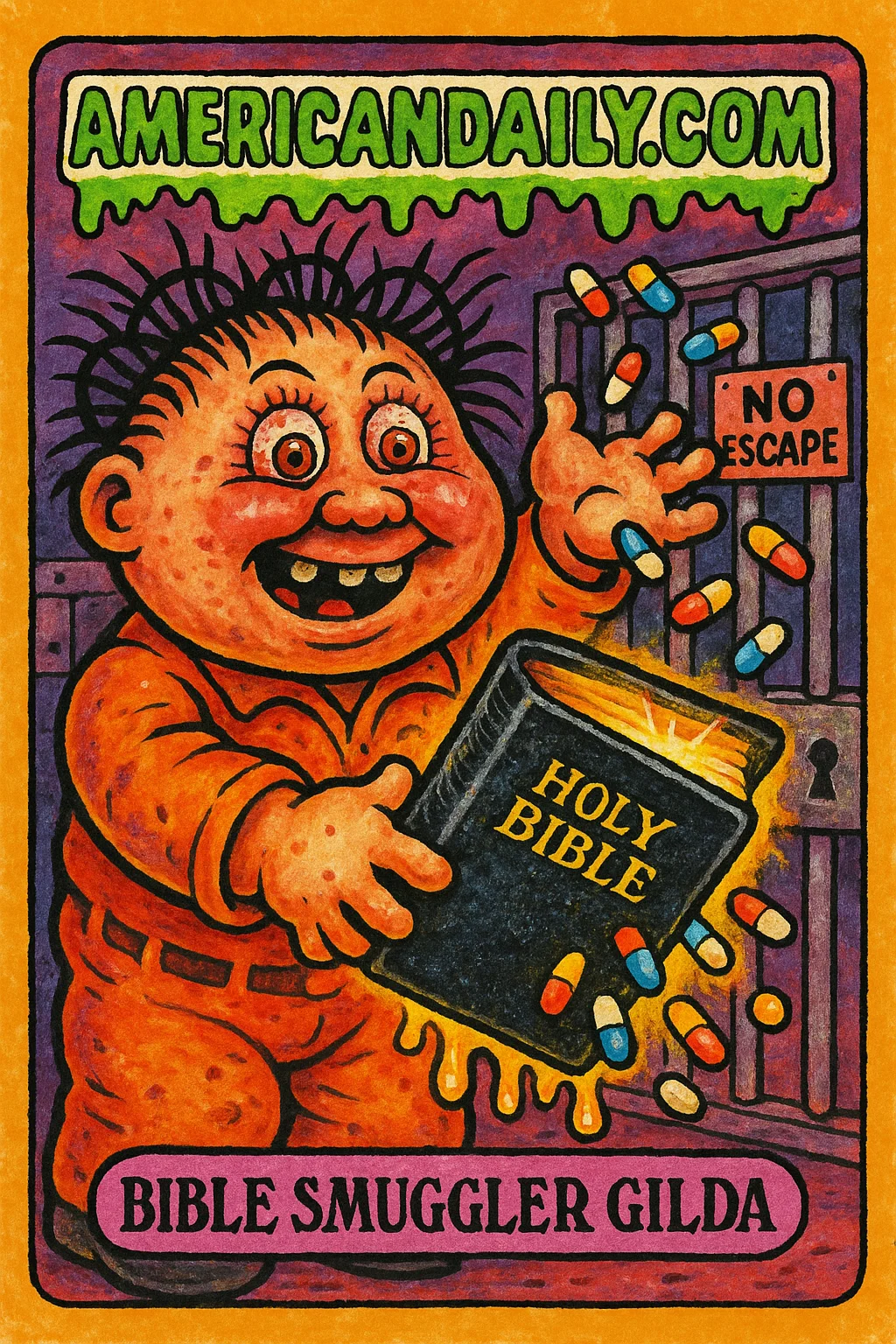 A satirical take on the bizarre crime of a Texas woman jailed for mailing drug-soaked Bibles to inmates. Our card features 'Bible Smuggler Gilda'.