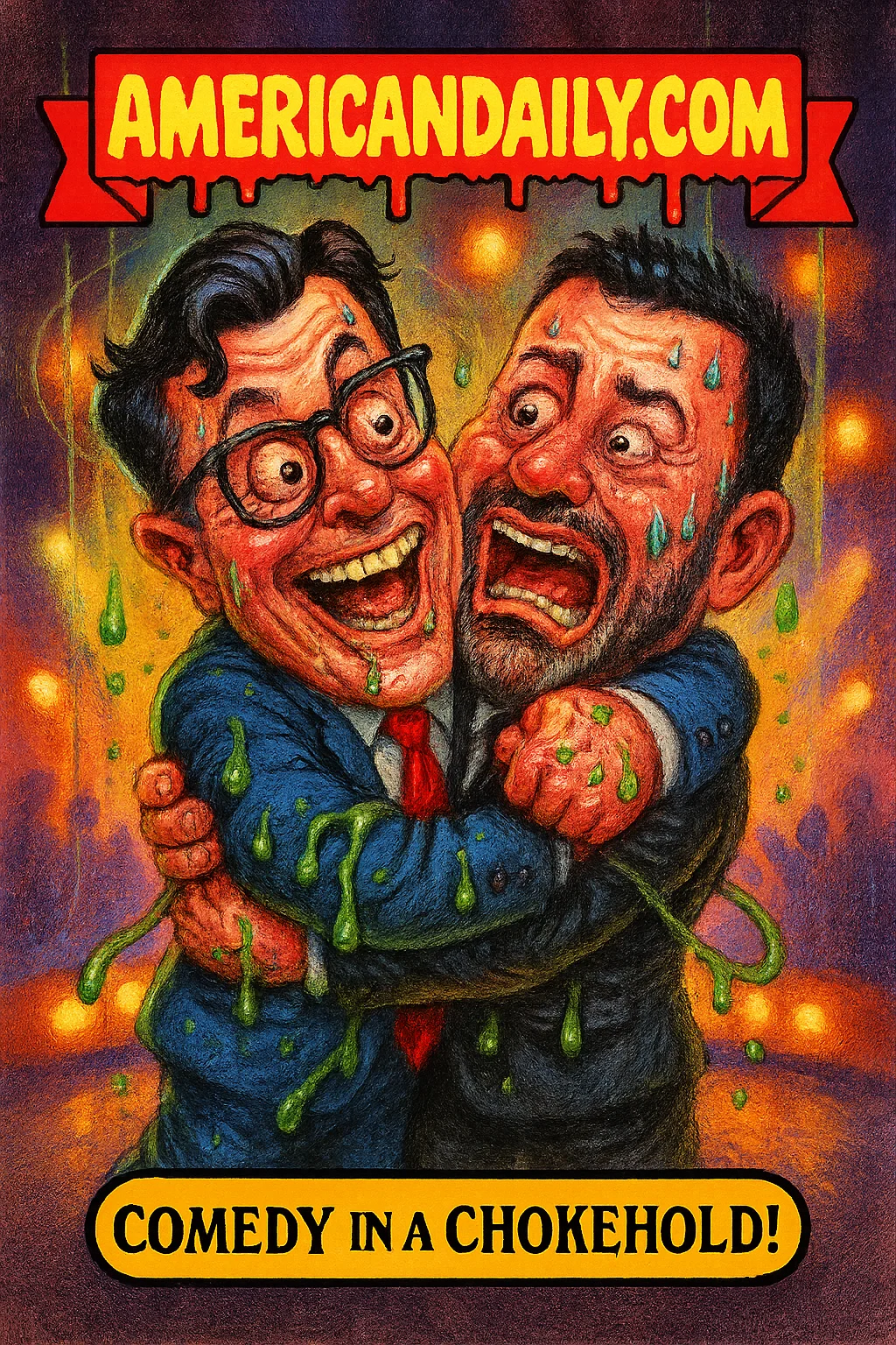 A tribute-style parody card showing Colbert and Kimmel embracing in defiance of censorship pressures, with shadowed network power above and protesters raising their voices behind.