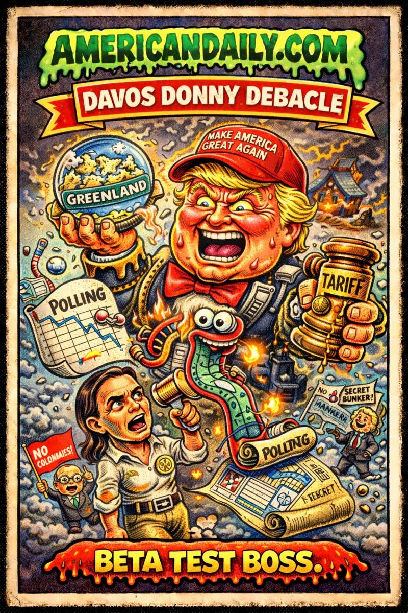 A satirical trading card capturing President Trump's one-year anniversary in office, featuring heated Greenland ambitions, escalating tariffs with European allies, secret bunker rumors, and disappointing poll numbers - all wrapped in absurd Garbage Pail Kids style.