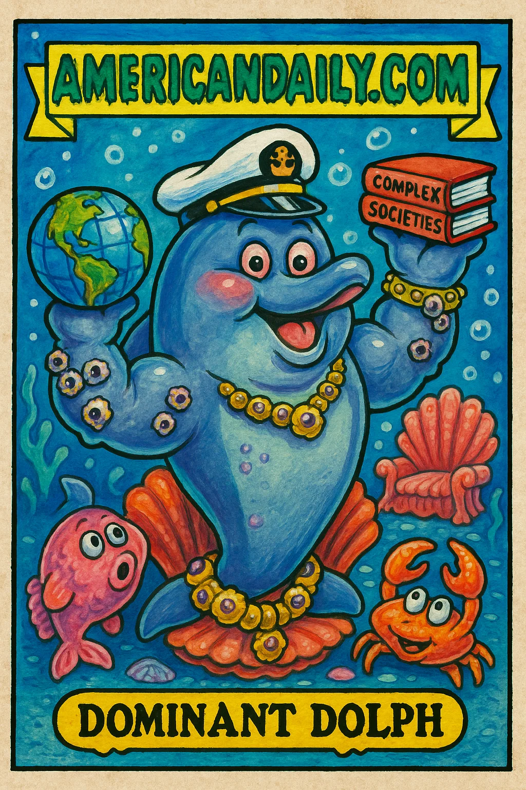 A recent study explores the hypothetical scenario of dolphins becoming the dominant species on Earth due to their large brains and complex societies. It suggests that having hands could have enabled dolphins to manipulate their environment and rise to the top of the animal kingdom. This satirical trading card imagines such a world, with a dolphin hilariously assuming the role of planetary ruler.