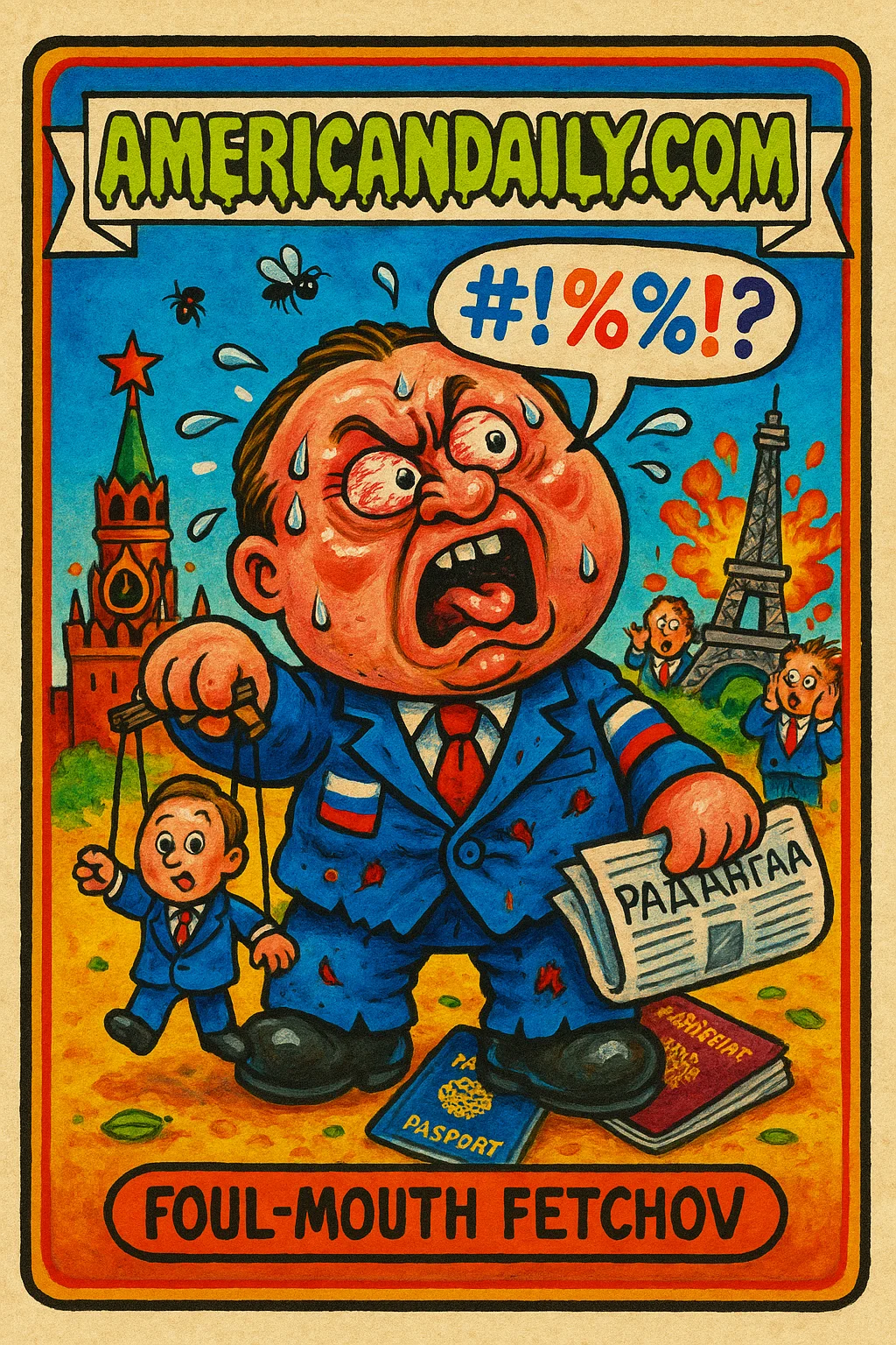 In a bizarre diplomatic twist, Kremlin officials deny allegations of using expletives towards France. A playfully heated caricature of the exchanges.