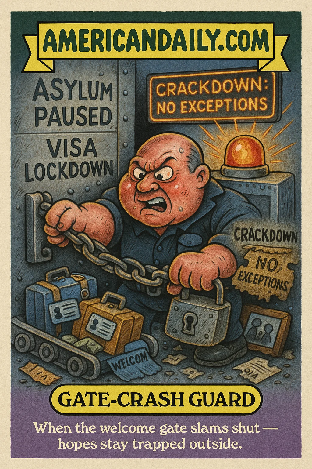 A satirical trading-card style meme called "Gate-Crash Guard" - lampooning the sweeping immigration crackdown ordered by the Trump administration after the D.C. National Guard shooting. The card turns closed borders and frozen asylum queues into a grim, exaggerated cartoon of steel gates, chained doors, and abandoned dreams.