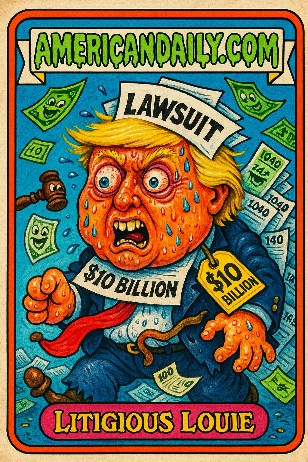 In a bizarre twist, Trump sues his own IRS for $10 billion, catching a judge's attention for all the wrong reasons. This satirical card features the absurdity with comic grotesque flair.