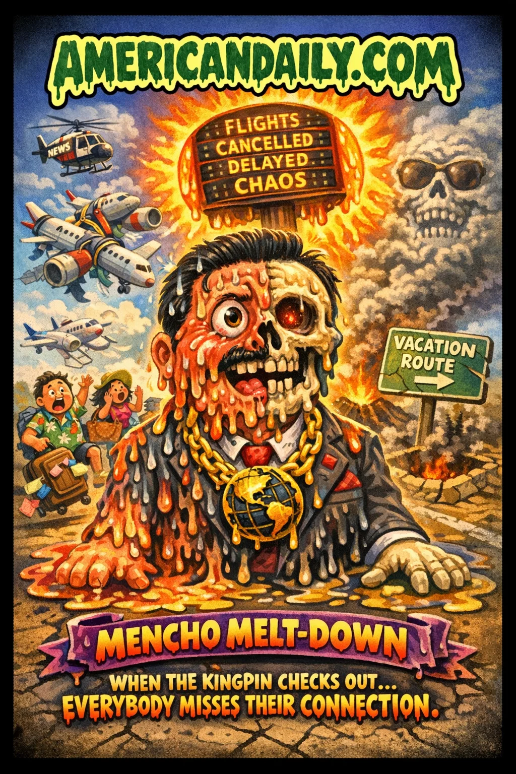 As reports swirl about the death of notorious cartel leader "El Mencho," shockwaves ripple across Mexico - triggering security crackdowns, airport disruptions, and widespread travel confusion. Our latest satirical trading card captures the explosive mix of criminal drama and unexpected vacation chaos in grotesque, over-the-top style.