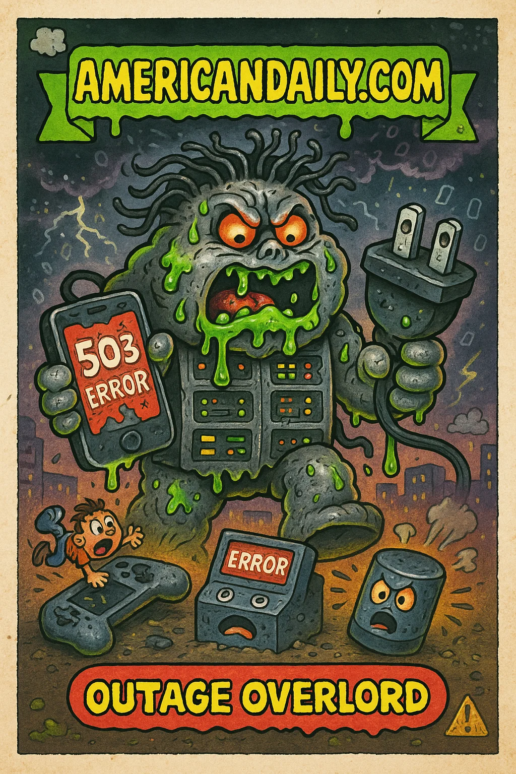 A satirical card capturing the chaos of a major cloud-service outage: apps freeze, games halt, banks lock down-and the clowns in the cloud just watch.