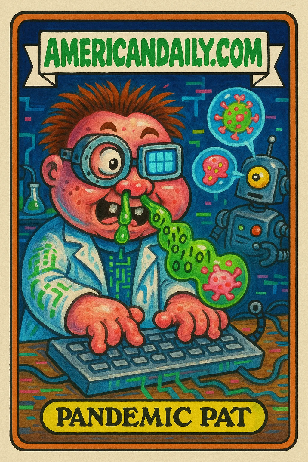 A satirical take on scientists creating a fake illness that an AI system mistakenly spread as actual news. Features grotesque characters blending science and technology with surreal comedic elements.