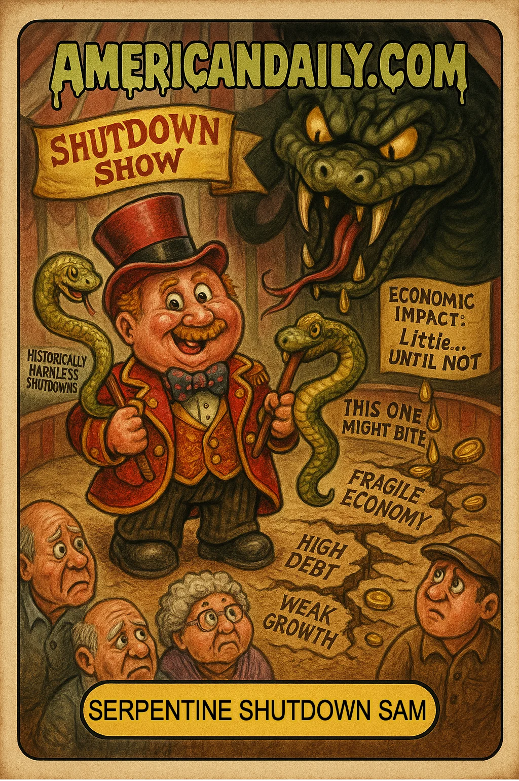 A satirical card mocking how shutdowns historically appear harmless - yet this time, lurking beneath the surface, a "Risk Serpent" waits to strike amid a fragile economy.