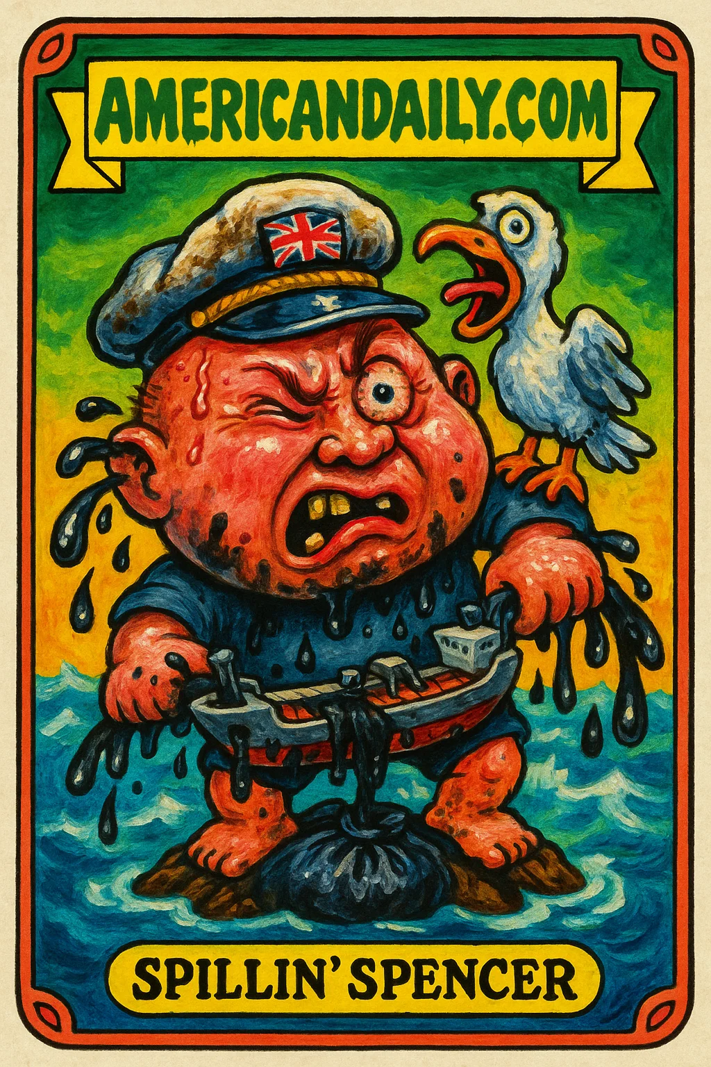 A satirical take on the UK and Russia's conflict over suspected oil tankers. This card humorously exaggerates the tensions with a grotesque character and over-the-top visuals.