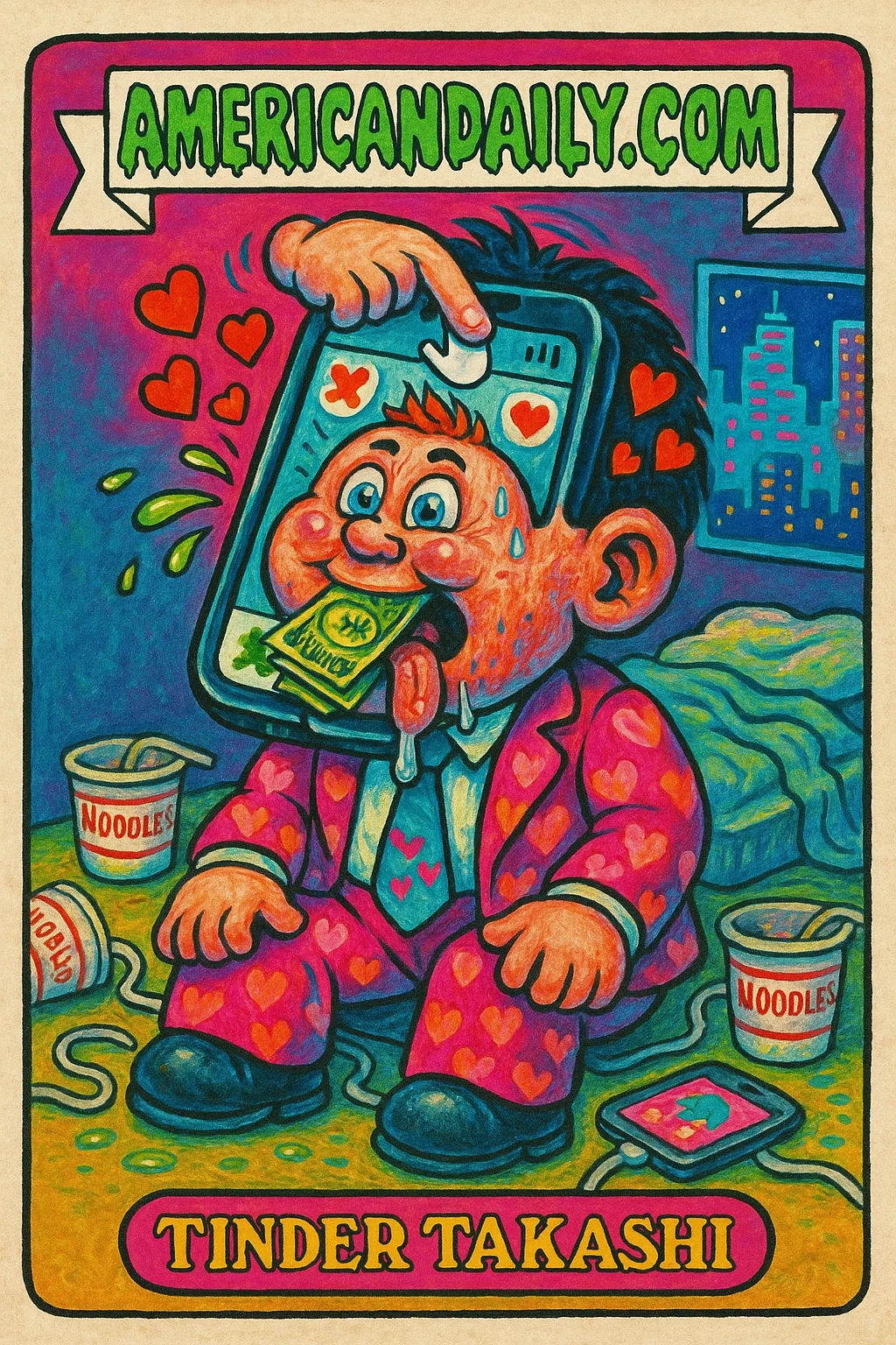 Delve into the bizarre as Japan offers citizens 20,000 yen to boost Tinder use. Our trading card captures the grotesque hilarity of this cultural phenomenon.