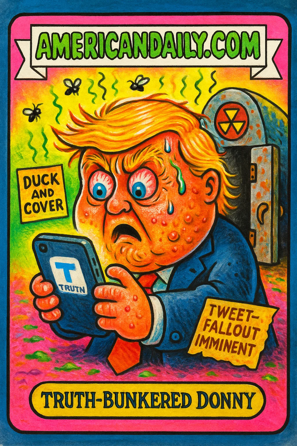 A latest Truth Social post by Donald Trump prompts absurd fears about needing a bunker. Humor and satire meet in this exaggerated trading card.