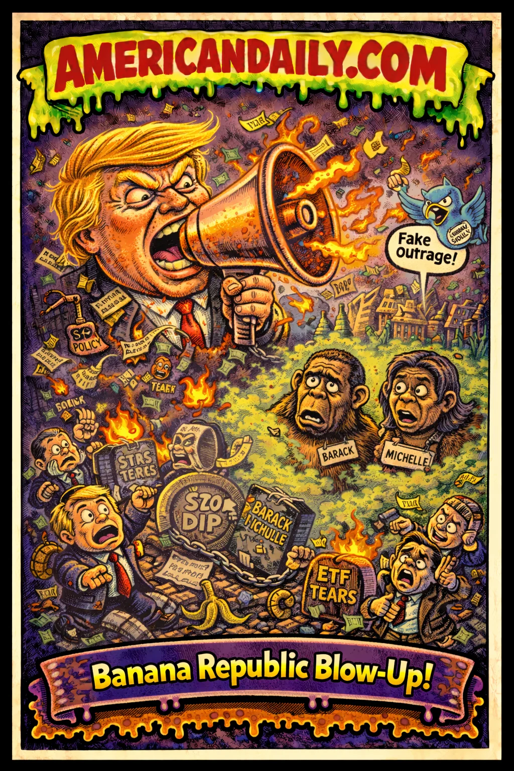 A satirical trading card satirizing the uproar after Trump shared (then deleted) a racist video depicting the Obamas as apes, triggering rare bipartisan criticism during Black History Month.
