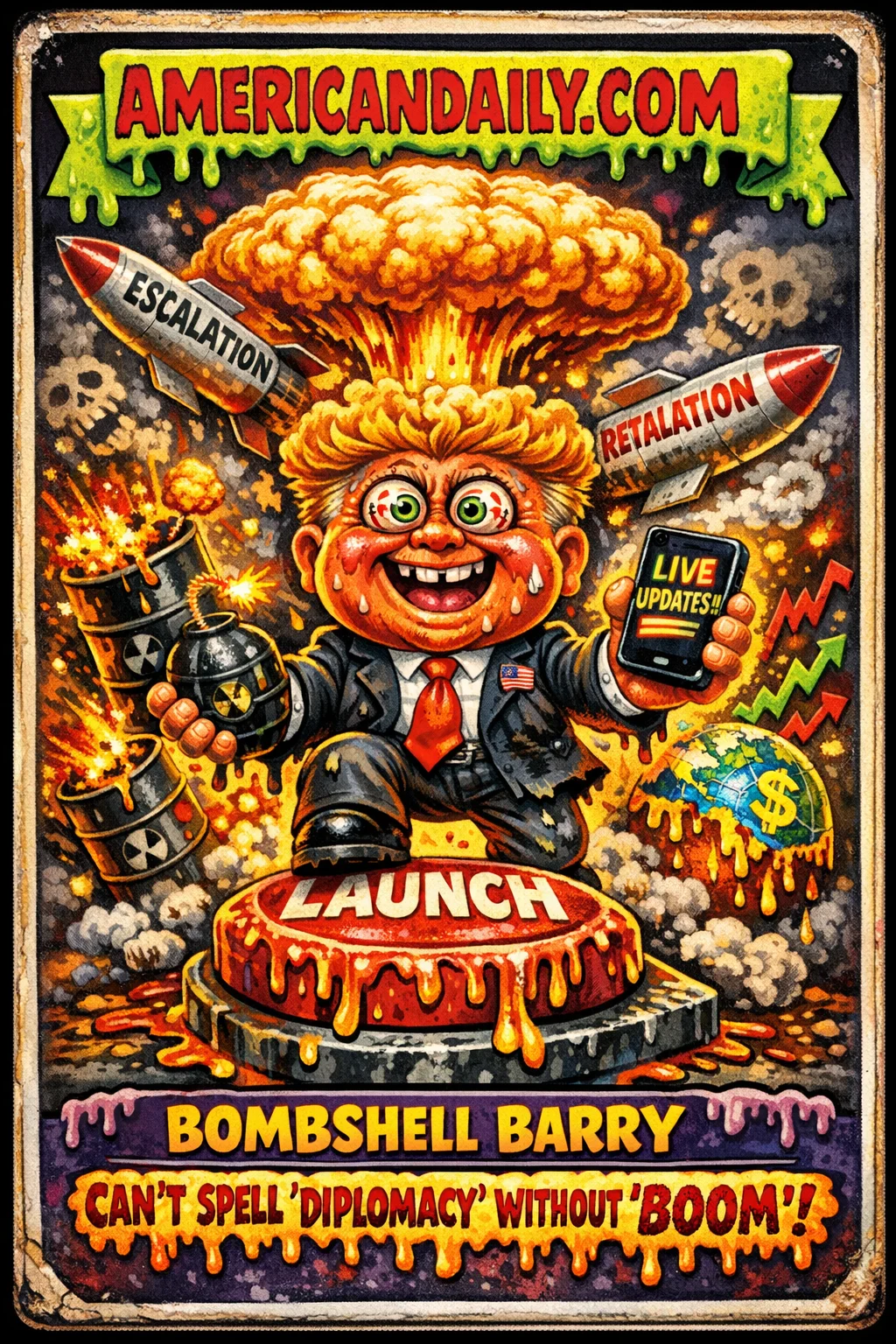 When diplomacy goes nuclear and headlines turn into live-blog fireworks, Bombshell Barry is already smashing the big red button. Markets shake, oil pops, and the world refreshes for updates - because nothing says global stability like a little prime-time escalation.