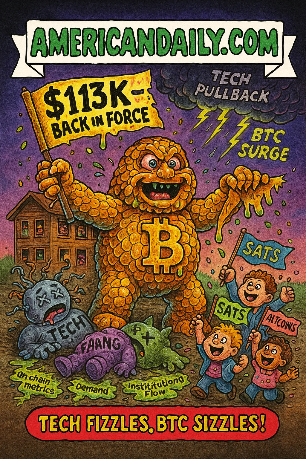 A satirical card capturing Bitcoin's dramatic bounce back past $113,000 while tech stock indexes struggle, with crypto investors cheering the surge and tech beasts lying in defeat.