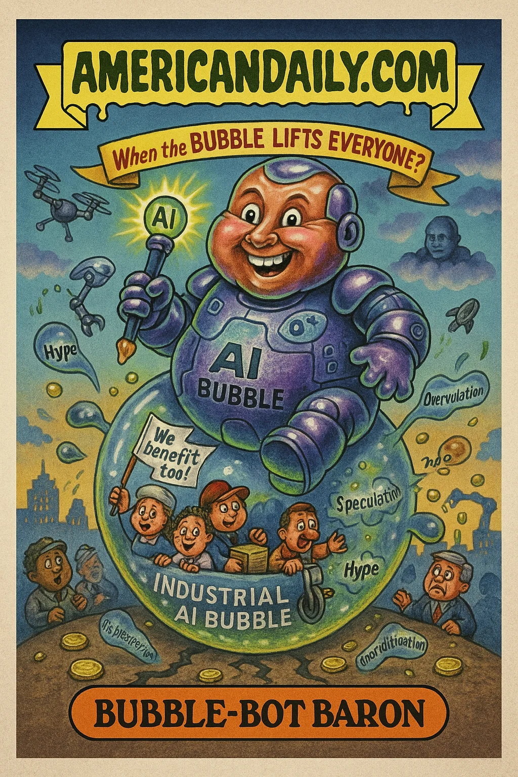 A satirical card illustrating Jeff Bezos' claim that AI might be overhyped - yet societal gains ride the bubble too, as small cracks of speculation burst around the buoyant grand vision.