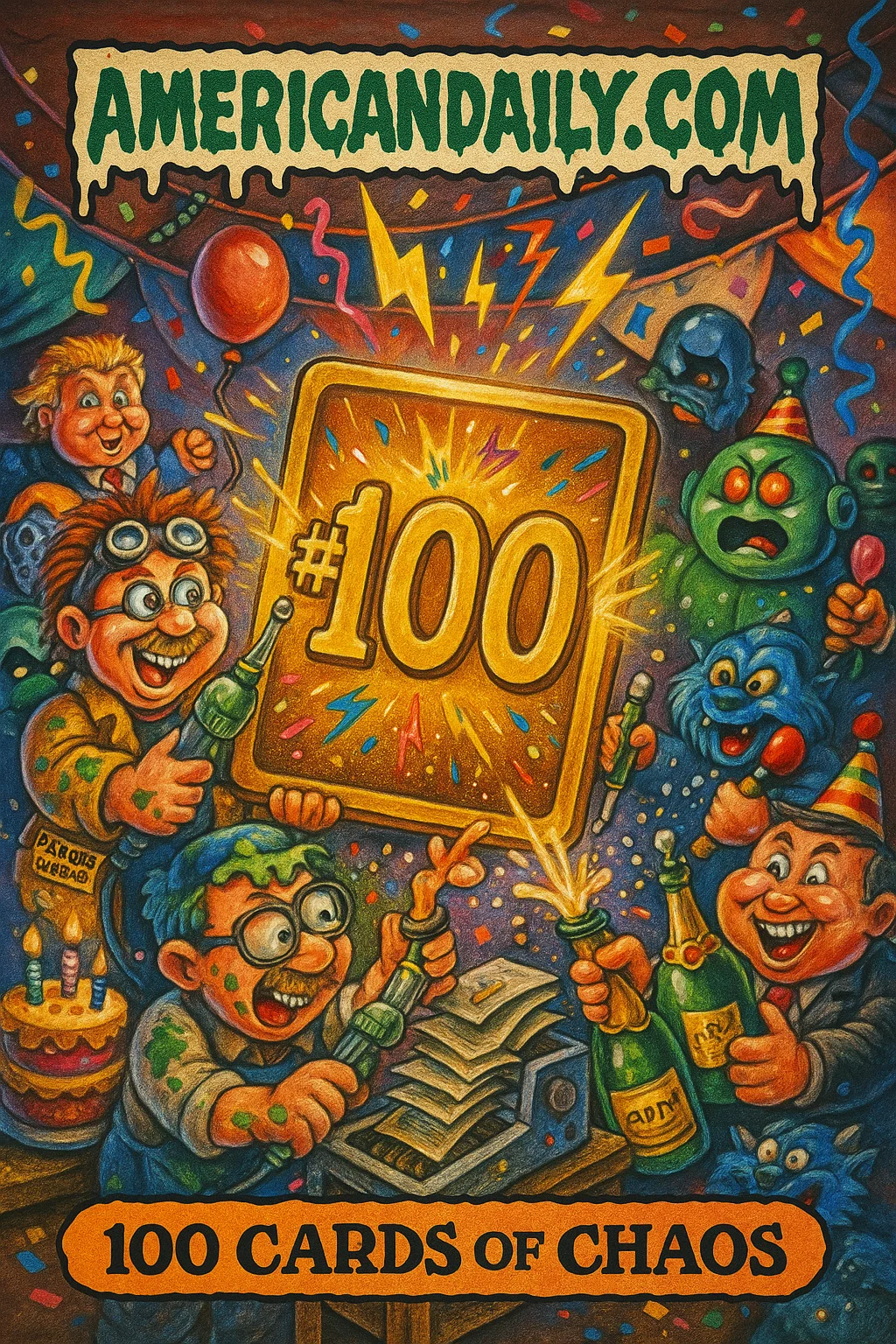 A parody tribute to AmericanDaily.com's 100th meme card - a wild celebration of satire, slime, and self-awareness, featuring all the chaos, color, and absurd humor that defined the collection.