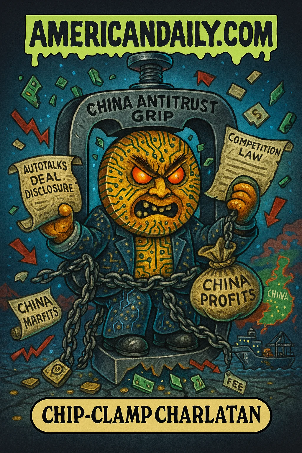 A satirical card visualizing Qualcomm caught in China's regulatory vise - the "Chip-Clamp Charlatan" trapped by antitrust pressure, clipping revenue and control in one dramatic tableau.