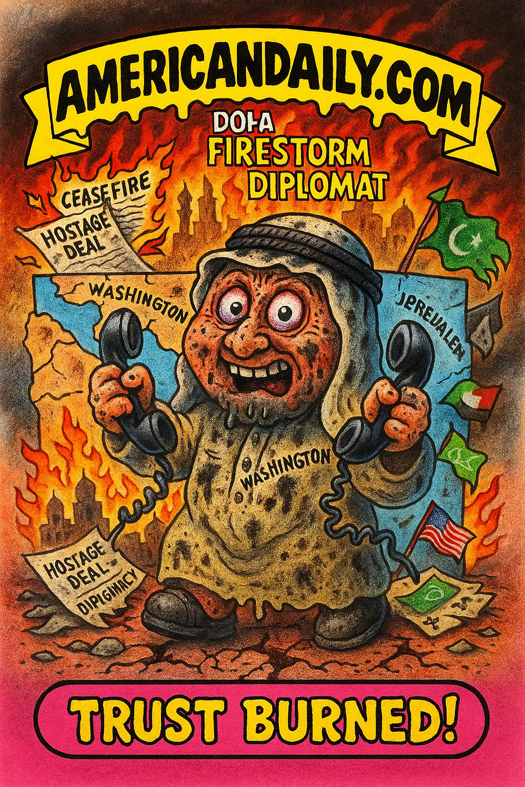A satirical card mocking the aftermath of Israel's Doha strike: diplomacy scorched, alliances tested, and trust erupting in flames.