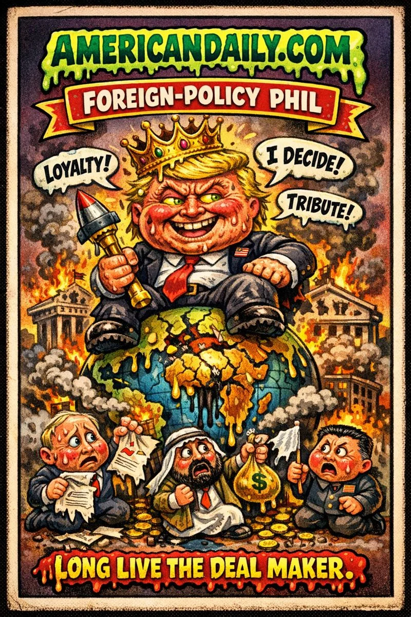 A savage cartoon satire capturing how Donald Trump's foreign policy vision is increasingly described as centralized, personal, and loyalty-driven - more monarchy than diplomacy.