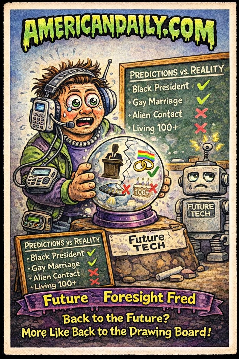 A playful Garbage Pail Kids-style tribute capturing the quirks of a 1998 poll asking Americans to imagine life in 2025 - and how some predictions surprisingly matched reality while others wildly missed the mark.