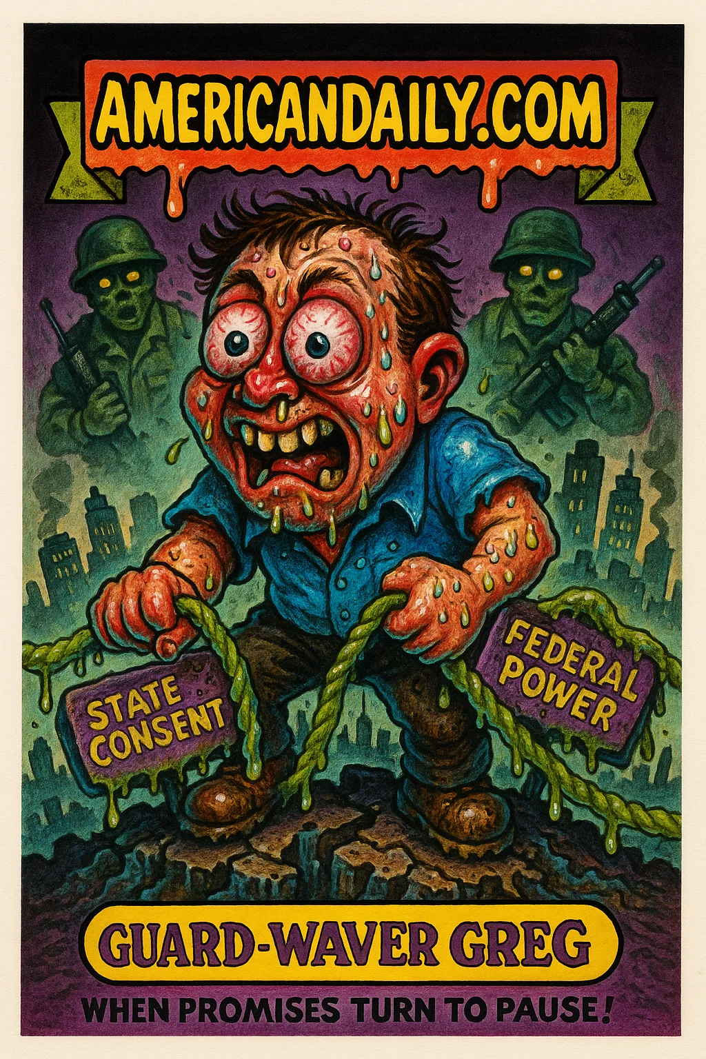 A satirical take on Donald Trump's uncertainty over deploying National Guard troops to Chicago-depicted via "Guard-Waver Greg", caught between federal power and state consent.
