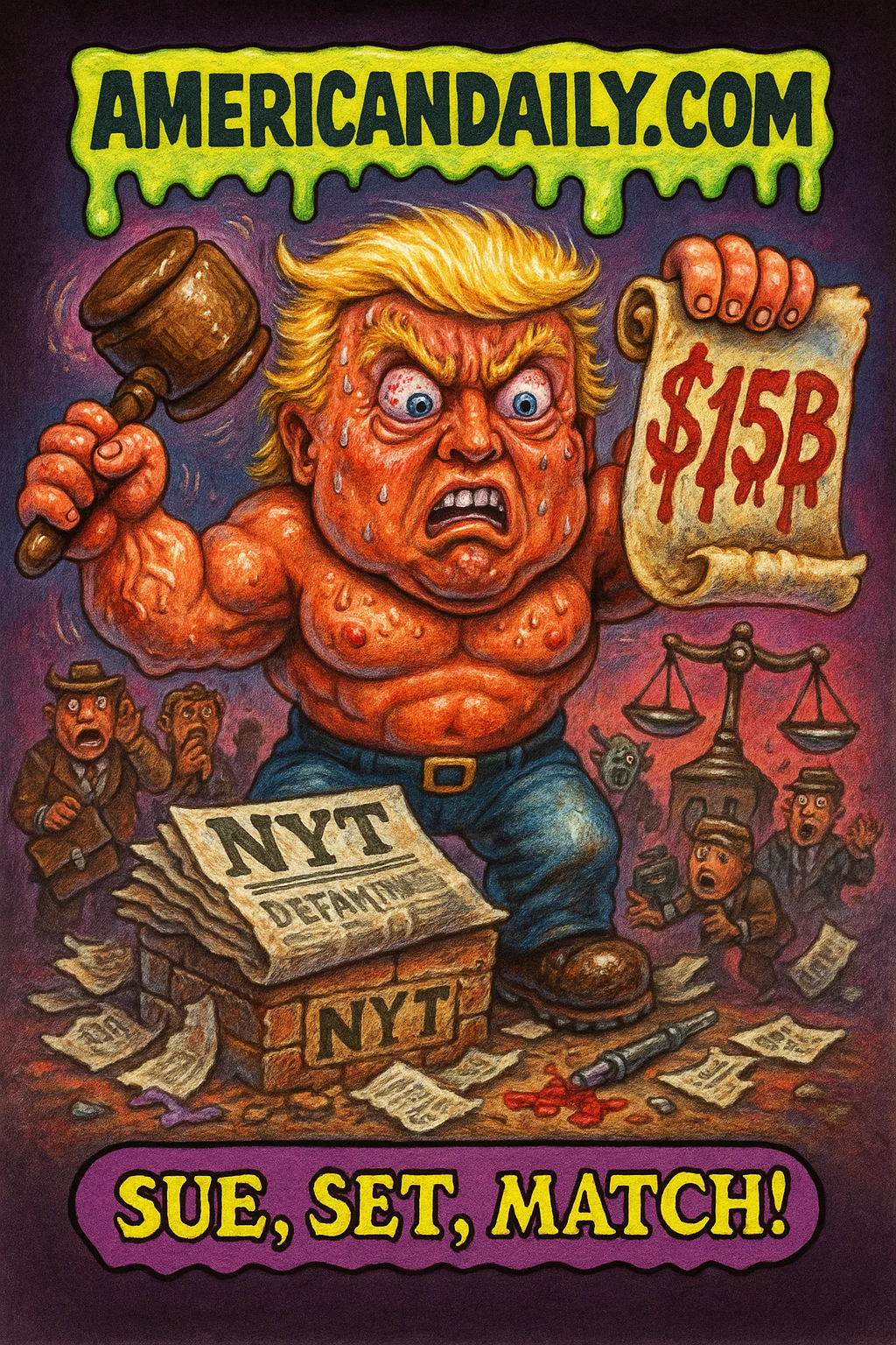 A parody card capturing Trump's large-scale lawsuit vs. The New York Times, complete with dripping headlines, courtroom drama, and legal chaos under the moniker Libel Litigator Trump.