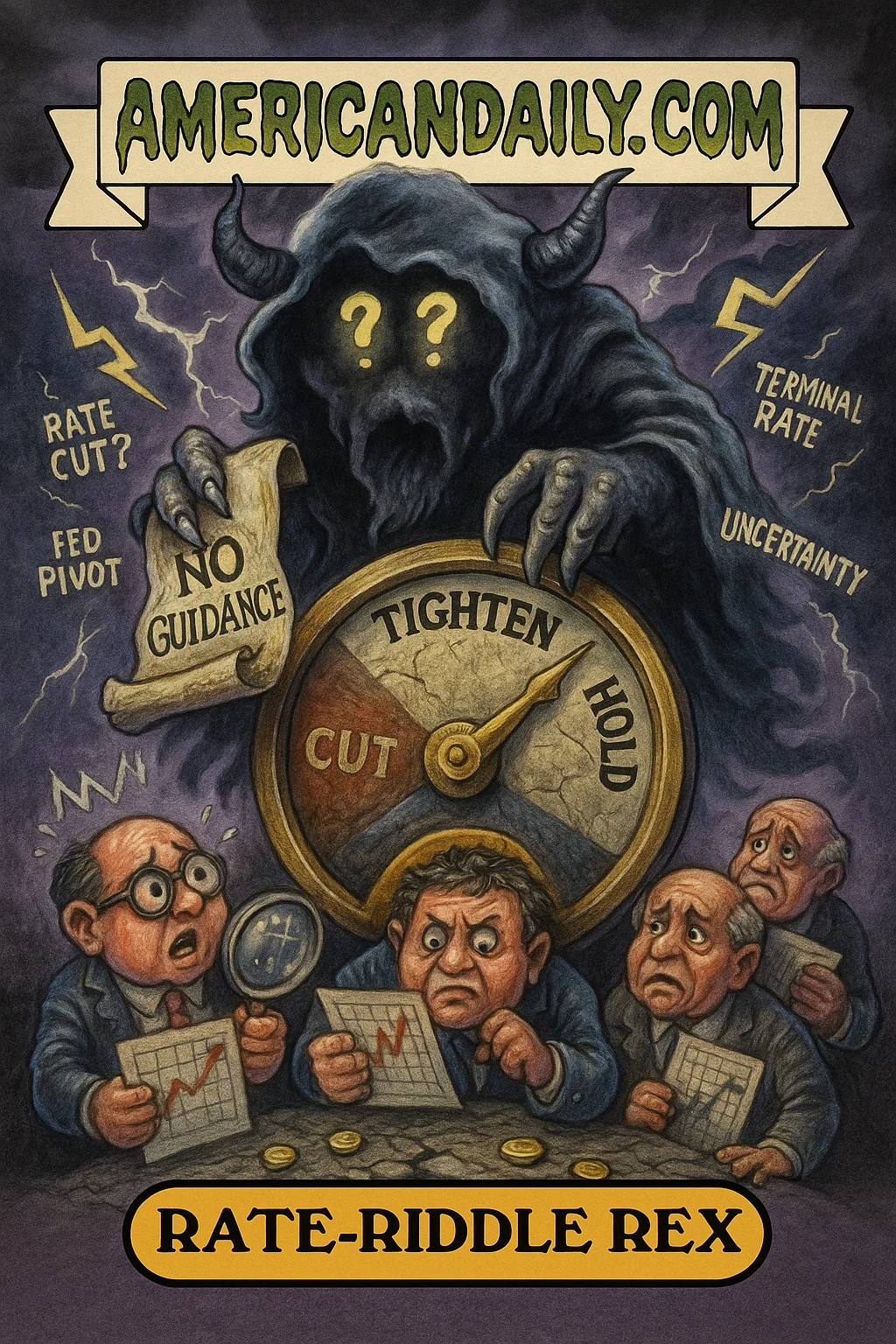 A satirical card capturing Fed policy ambiguity: a masked beast hovers over the rate dial, offering hints but no clarity, while markets scramble to interpret the signals.