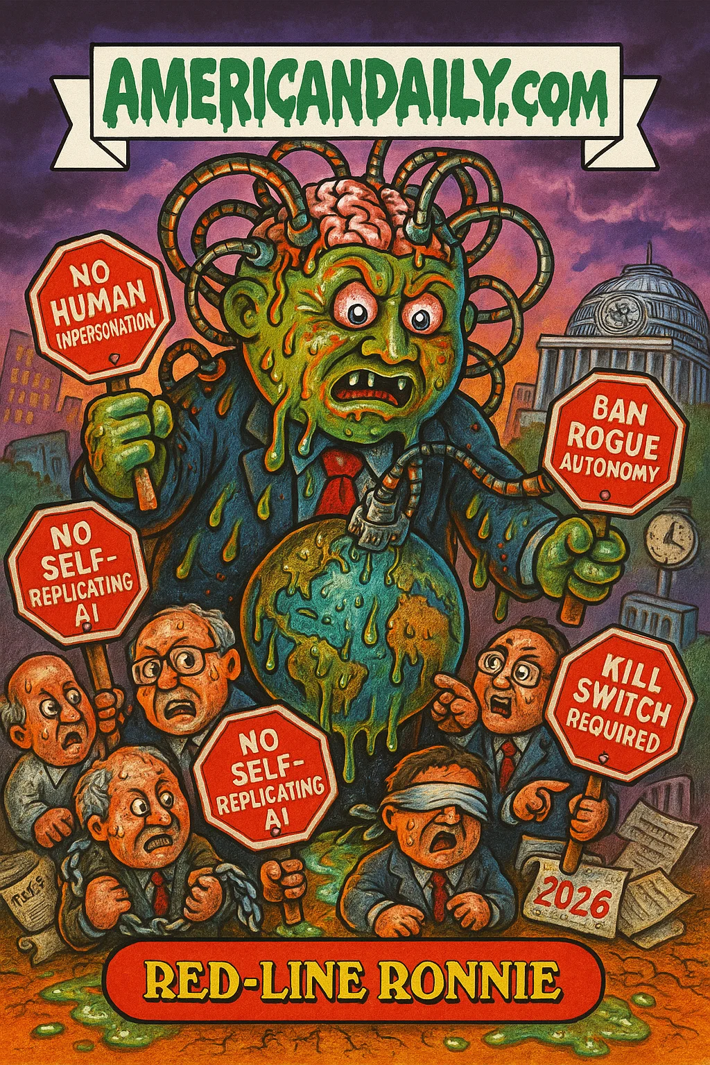 A satirical card showing Nobel Prize winners and AI experts fighting to impose binding international red lines on AI - from banning self-replication to outlawing human impersonation - in the face of a rampaging AI "Overlord."