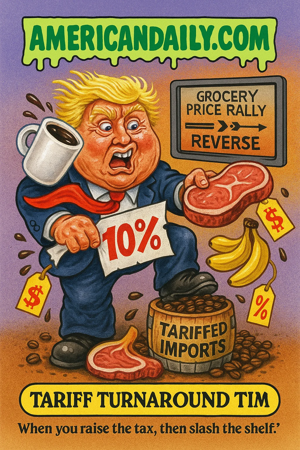A satirical trading-card style meme starring "Tariff Turnaround Tim," who dramatizes Trump's sharp reversal on food-tariff policy-going from tariffs to relief in one big move, with grocery prices and consumer pressure at the centre. It turns an economic shift into cartoon chaos.