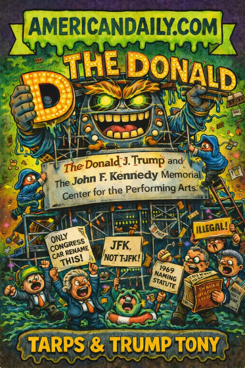 A grotesque AMERICANDAILY.COM trading card satirizes the controversial addition of Donald Trump's name to the Kennedy Center - showing workers installing "The Donald" on the building while critics, historians, and protest critters react in over-the-top cartoon chaos.